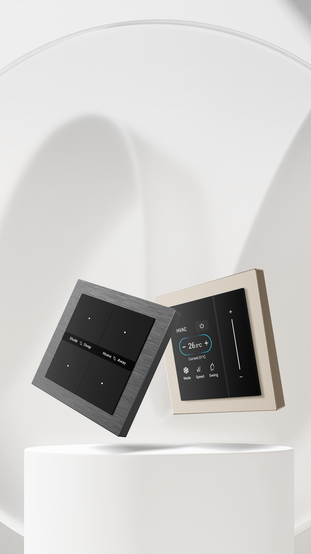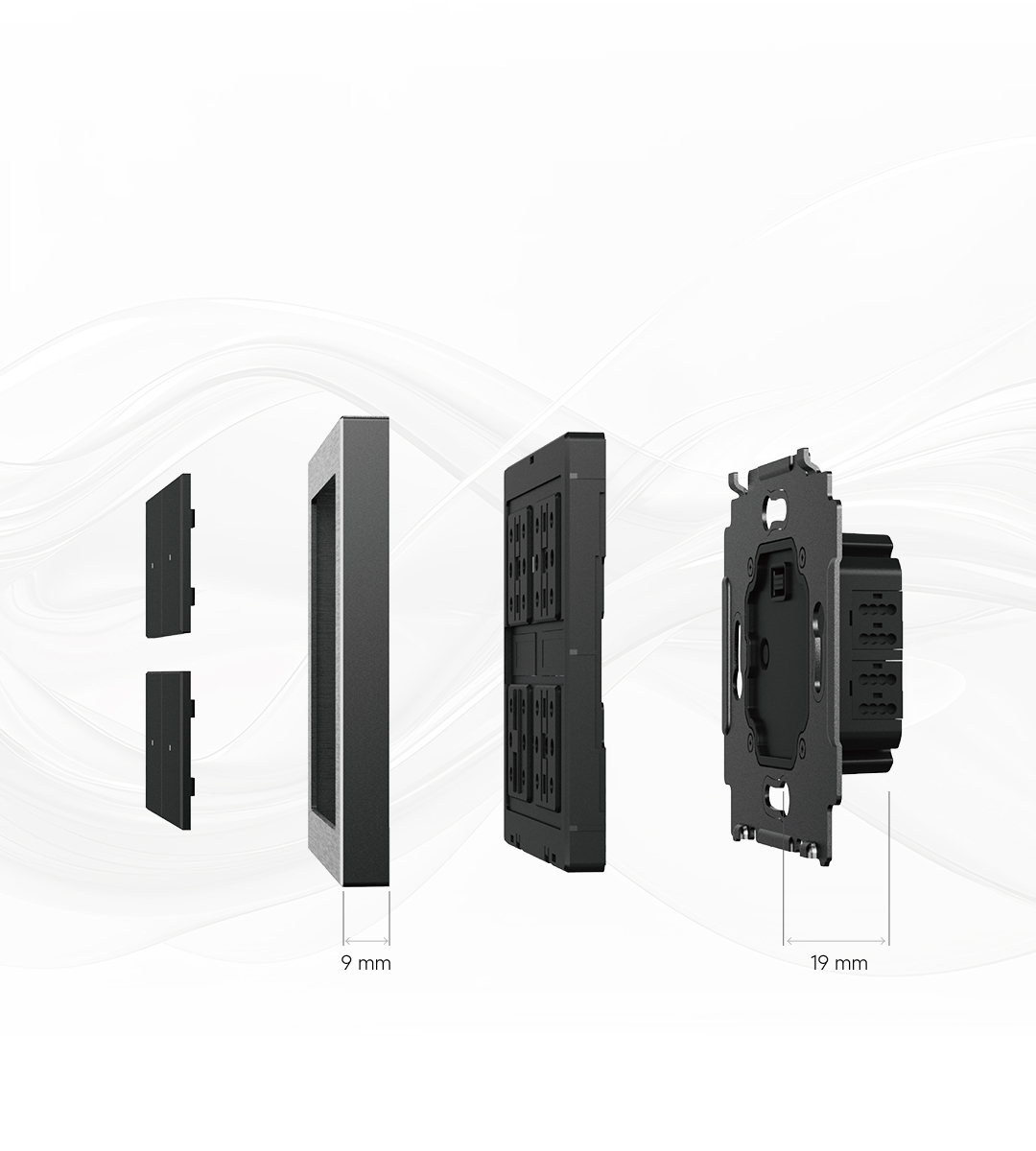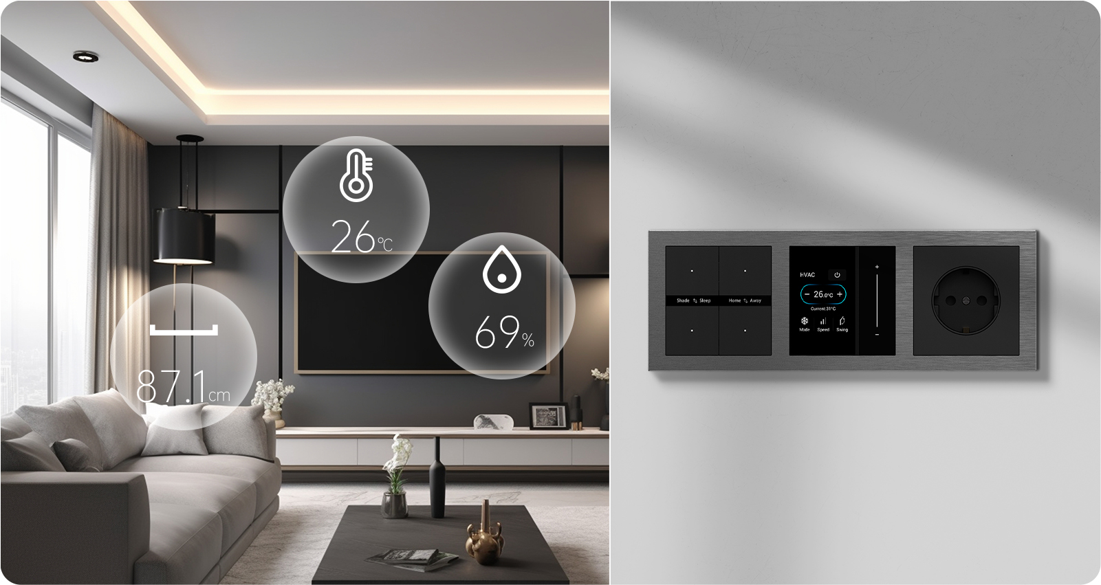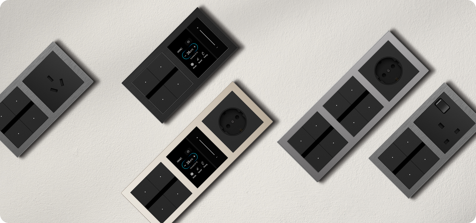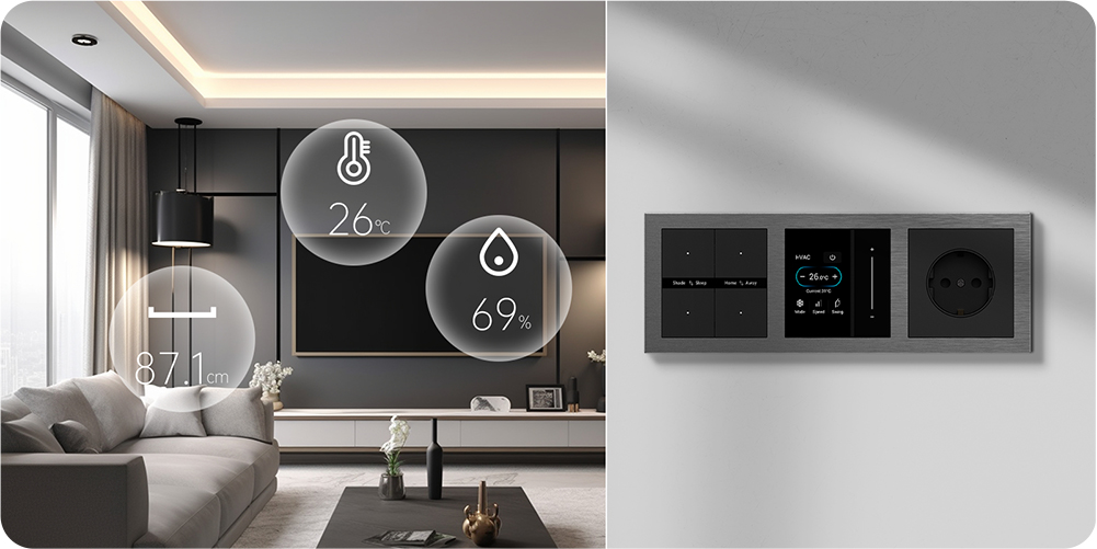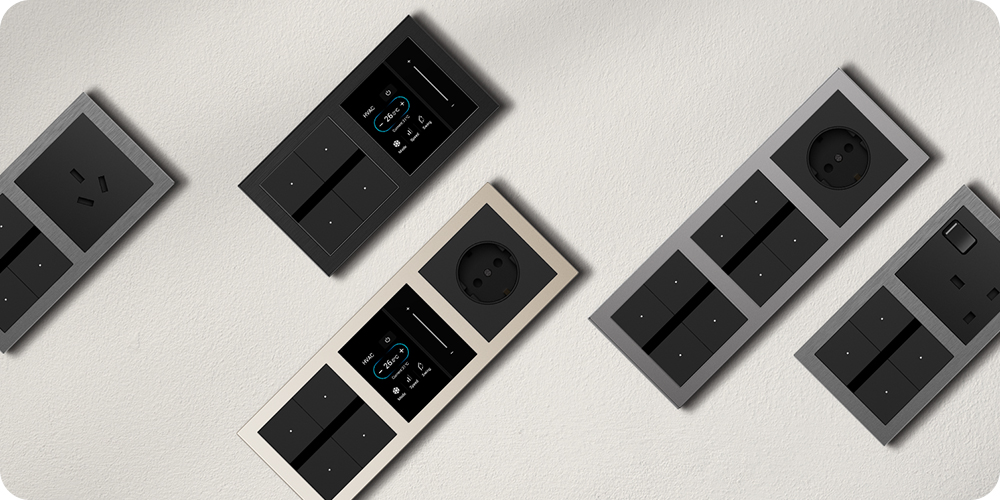 Break free from rigid switch panels. The Aura Series lets users mix switches, sockets, and temperature controls like building blocks. Users can customize the faceplate setup to match both the functional needs of their space and personal styles.