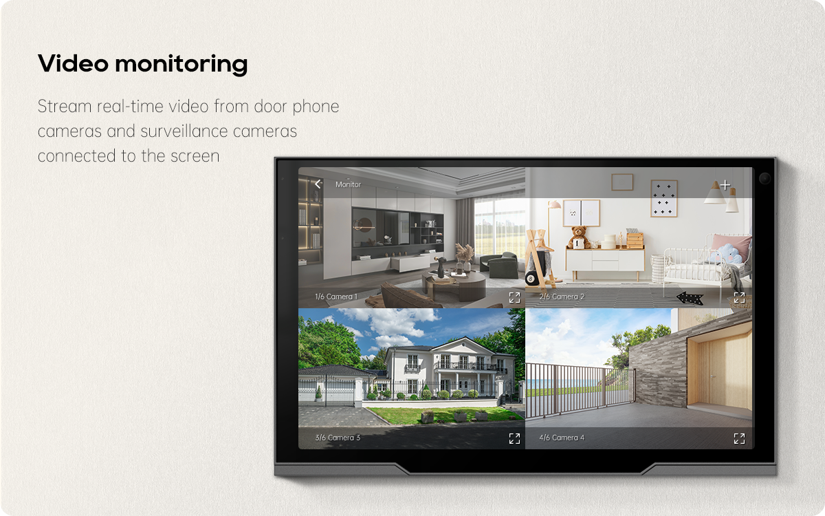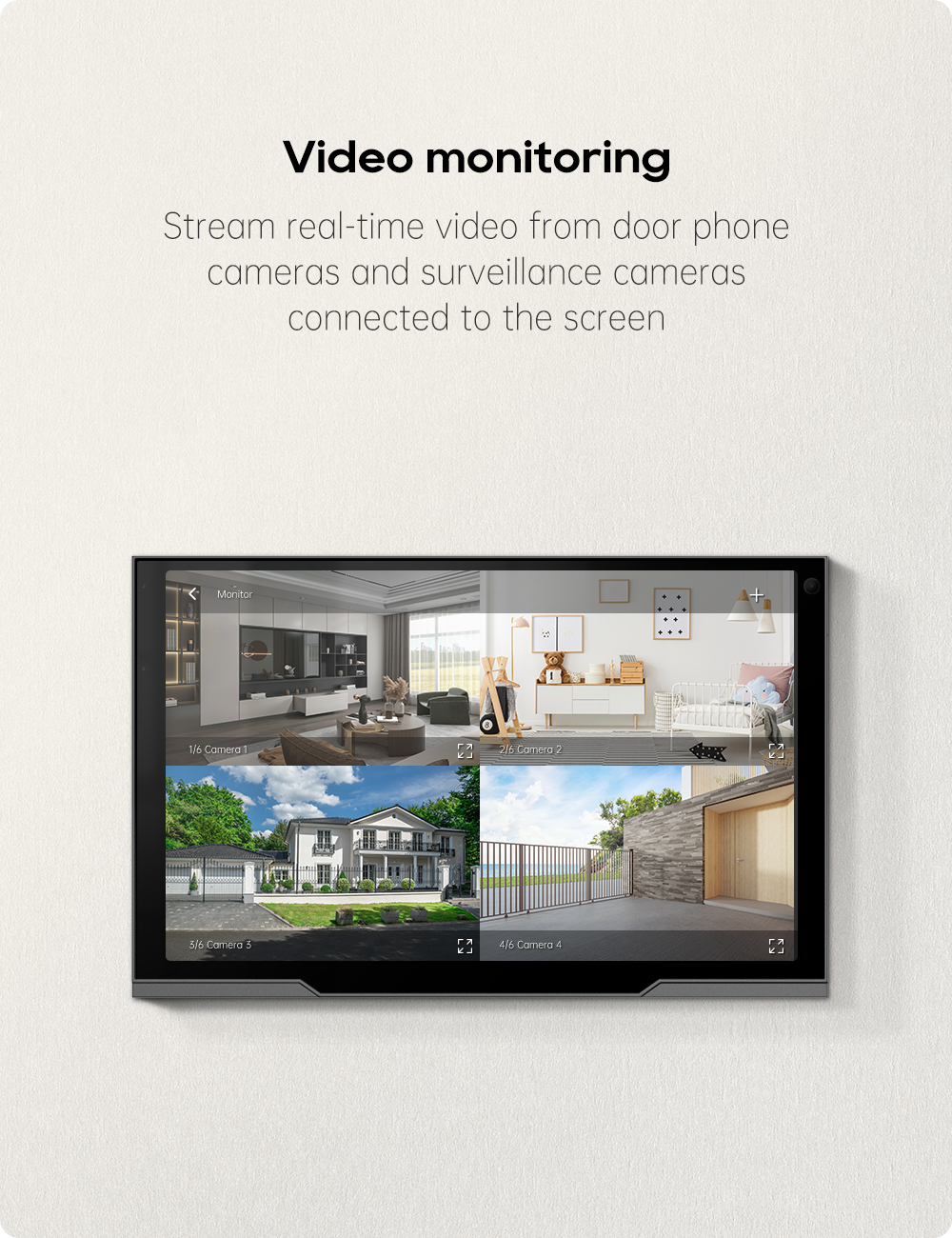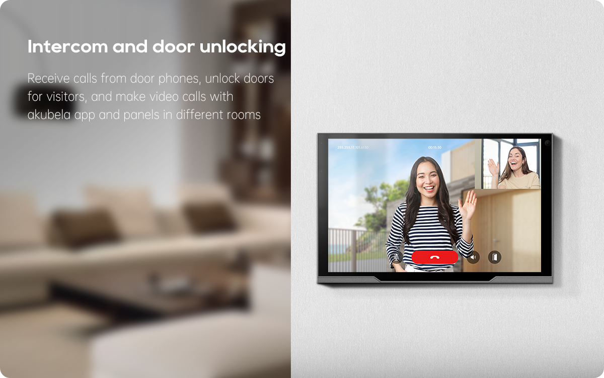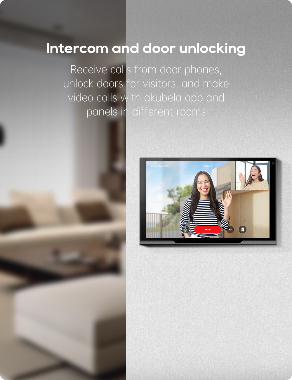 The built-in 5MP camera comes with a privacy shutter. This ensures your peace of mind about your data and privacy while enjoying camera-based features like video monitoring of your home's status, video calls via the akubela app, and room-to-room video communication between panels.